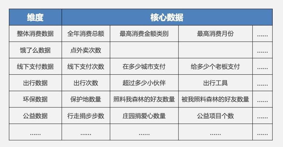 支付宝年度账单的数据维度有整体消费数据、饿了么数据、线下支付数据、出行数据、环保数据、公益数据等维度,包含以下核心数据: