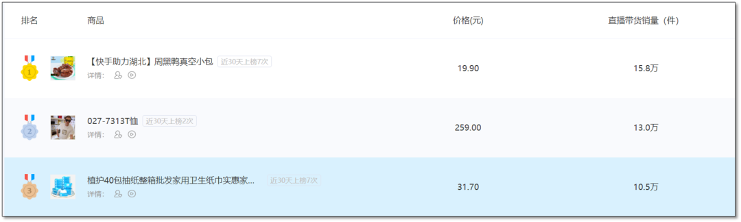 ▲快手商品榜,7日直播销量最高的产品,数据来源:卡思数据