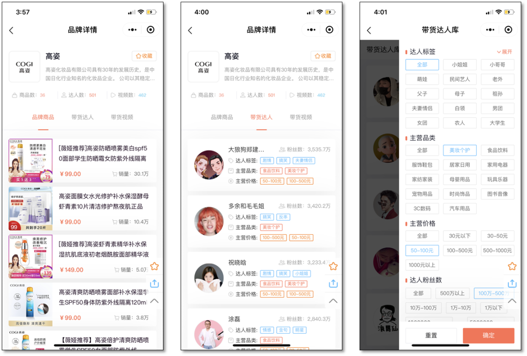 而从“人和”上看:高姿选择了批量达人种草带货,无论是红人应用的广度还是深度上都更加充分,与此同时,产品打出的买赠、低价销售的策略,也很容易让用户动心,自然能够带来不错的转化。