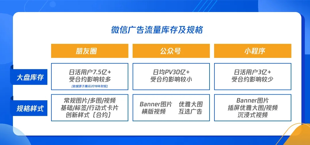微信广告可分为两大类流量:朋友圈广告与非朋友圈广告(公众号/小程序广告)。两类流量的投放技巧与素材要求有较大差异,需要优化师采取不同的投放策略。