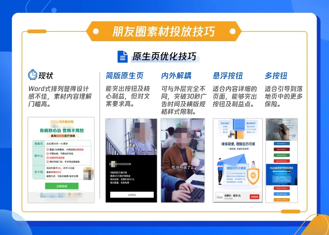 对于原生推广页,应避免大段文字的专业性陈述。如果有较好的文案,可使用凸显文案的简版原生页。另外,朋友圈广告已支持内外解耦,可在原生页展示与外层不同的素材,突破广告时长与规格样式的限制。