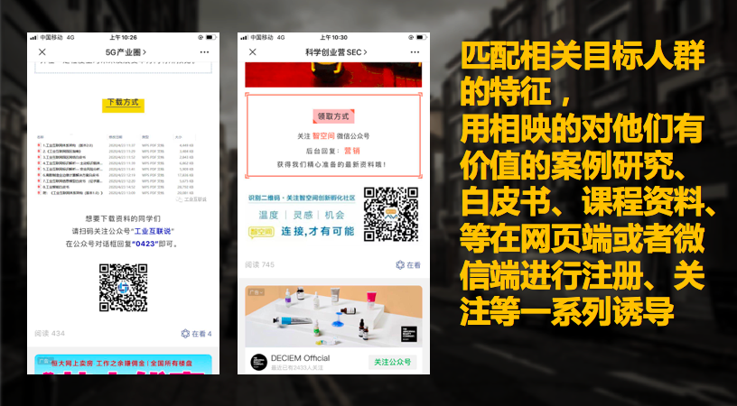 1.通过前期的诱导、营销组合活动来获取用户的关注,从各个渠道获取客户线索到私域;