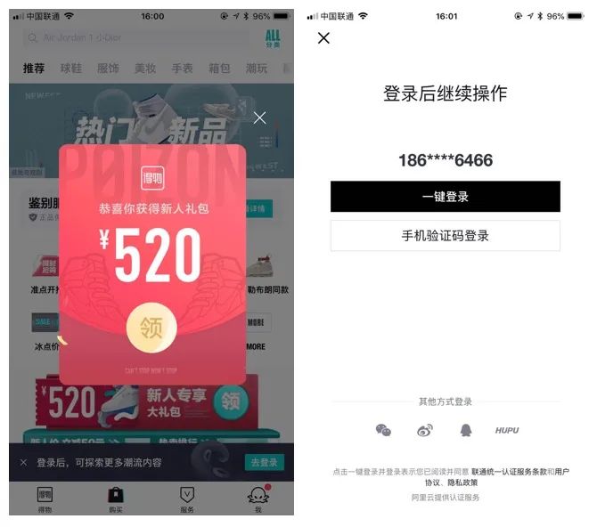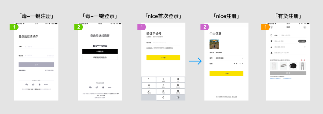 (1)登录「nice」必须先进行注册/登录操作,而「得物(毒)」「有货」并不需要。增加用户激活的阻力;