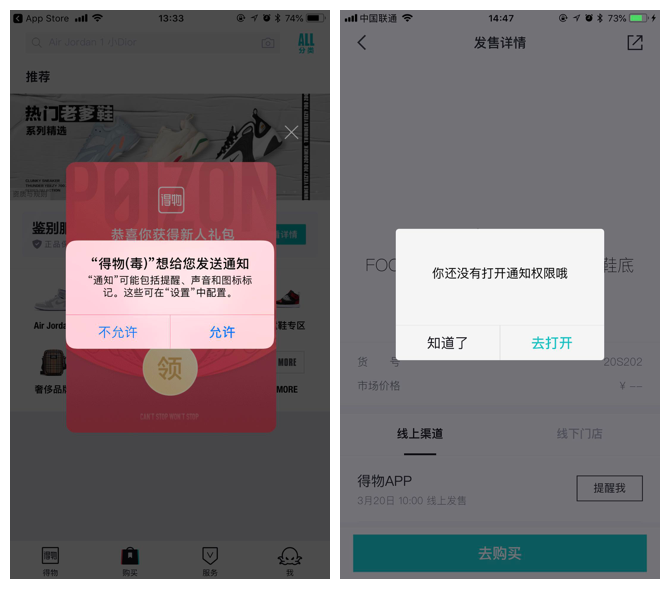 「得物(毒)」没有提醒用户开启【推送】功能的提示文案框,此处相较于其他两款产品显得不专业。