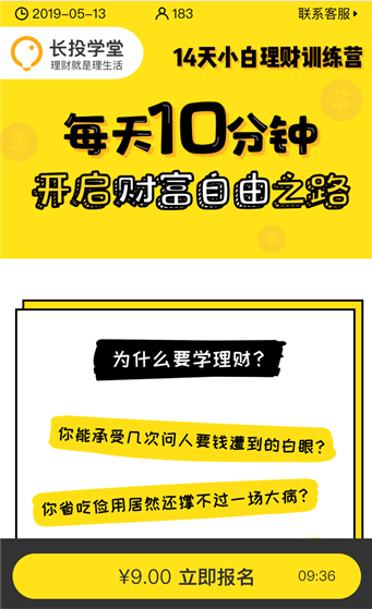 拉新群需要承担拉新,体验服务,促进转化的作用。在这一步,新用户会被养熟,变成付费用户,哪怕只是付了很少的钱买了一个低门槛的引流产品也算。比如很多在线教育公司的7天训练营,21天训练营就属于这种。比如大家可以看到下面“长投学堂“做的9.9的14天小白理财训练营。