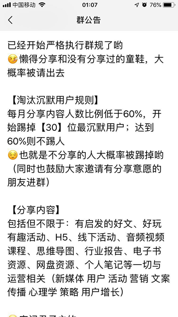 国有国法,群有群规。规则的存在是让人知道这个群鼓励做什么,不能做什么。需要提醒的是,让规则人性化,每个群里都有想打广告的人,你可以通过引导让他们合规的做软广,而不是这也不能做那也不能做,让人觉得不自在。