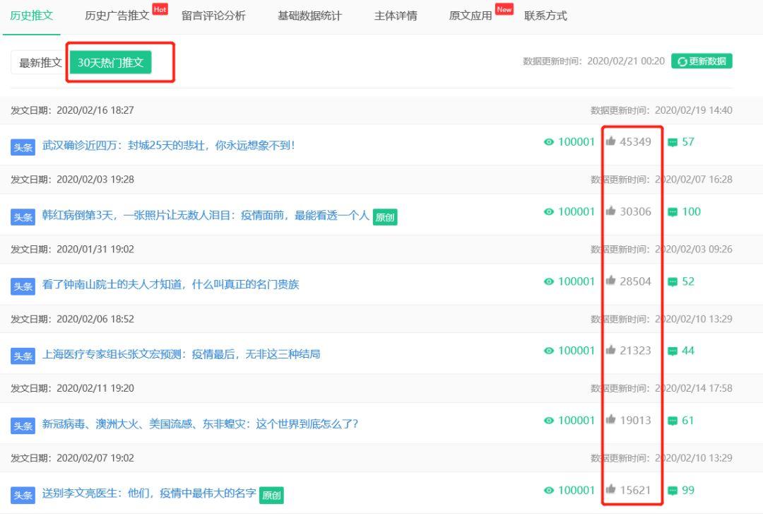 因此,我们把这几个方面的所有大号都关注了,然后通过西瓜数据,查看这些号近30天热门推文,先对比哪些文章选题最贴合我们账号,其次再对比该篇文章的点赞数与往期文章点赞数,若该篇文章在看数明显比往期文章都高,我们就转载这篇。