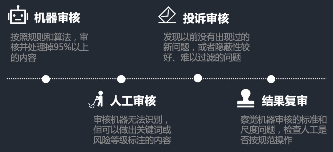 - 人工审核,虽然用户投诉审核和结果复审大多时候也是人工审核,但这里所说的人工审核,特指审核机器无法判别的内容,通常占平台内容数量的比例不超过5%,但对于一些大型的内容平台,绝对数量已经很多了。在内容爆炸的时代,我们看到许多平台在全国都有多个审核中心,每个审核中心的员工数量都成千甚至上万。