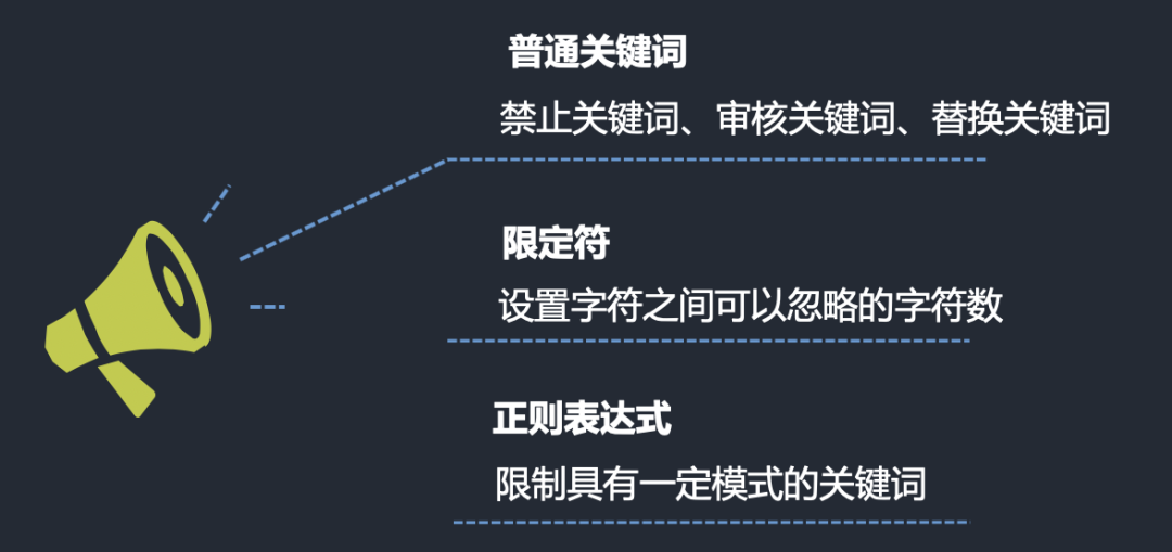 审核关键词,这是最常见的关键词种类,只要匹配到就会自动进入后台进行审核,文章中的关键词会被高亮并罗列出来,有助于审核人员快速判断。审核关键词也应该尽量是专属关键词,以防止太多内容被拦截到后台。