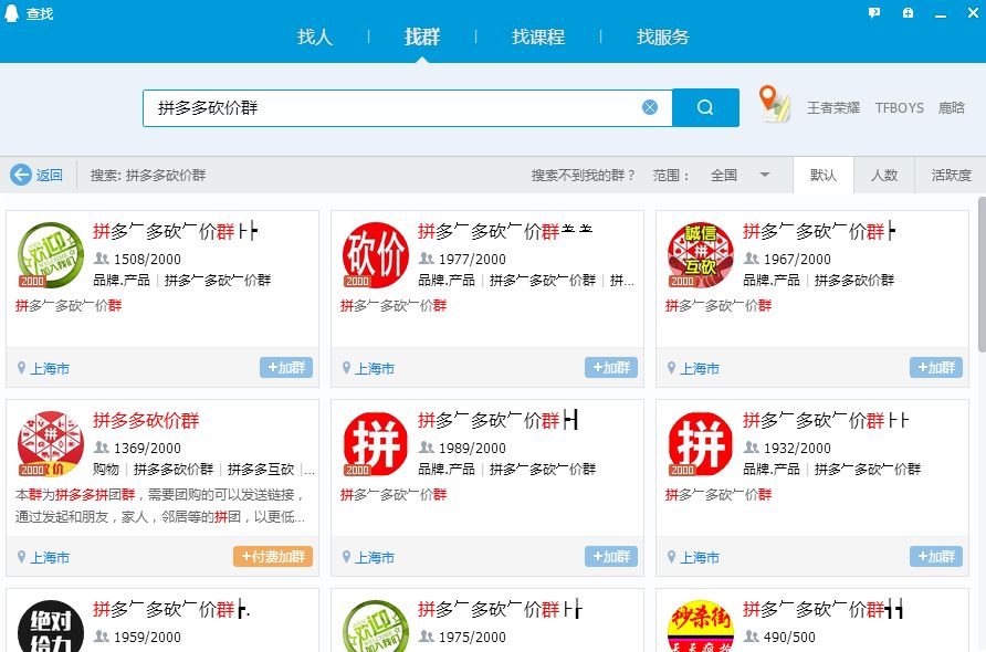 单拿“助力砍价”这一个模块来讲,你可以在QQ中以“砍价”搜索到上百个群,甚至有些群收费才能进入;你可以在淘宝中以“进砍价群”搜索到上百个商品链接,在这些群里,成员们只发链接不聊天,就能保持上千的消息日活跃;更甚至,在这些社群中产生了“换刀”、“骗刀”“一刀一块钱”等社群文化术语。