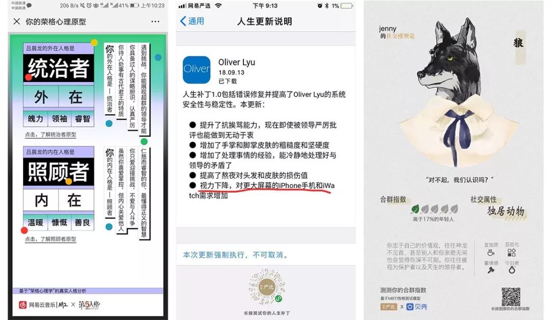 左边是荣格心理测试,中间是借势iPhone XS发布做个一个人生补丁更新测试,右边是与贝壳合作的社交动物原型测试。很巧,三个案例都出自网易之手。