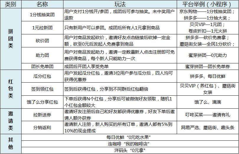 - 强任务:类似KPI指标,对结果负责。如1元拉新团中“邀请3位新人参团”、砍价团中“要求好友帮助砍到0元”、瓜分红包中“邀请3位好友帮助拆红包”;