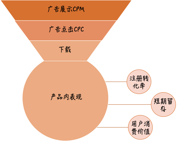 用一张框架图简单说明指标体系。首先,成本有不同环节的成本需要评估eCPM、CPC、CPI、CPA等等,伴随这些环节的成本,对应的就是流程中转化率指标的提升:点击率、下载转化率、注册转化率等。