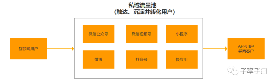 而对于合规要求较严的券商来说,通过新媒体(微信公众号、头条号、微博等)和轻应用(小程序和快应用等)直接以内容和产品的方式触达互联网用户;先把互联网用户变成私域流量池的用户进行沉淀和留存,而后再逐步将私域流量池的用户导入自己的APP或者引导证券开户。