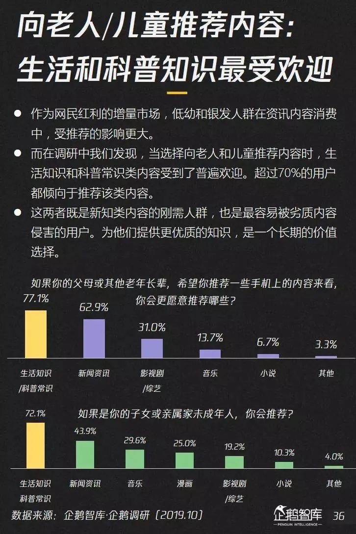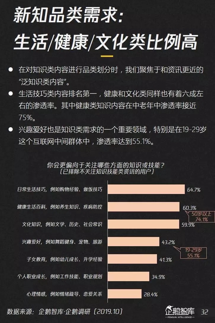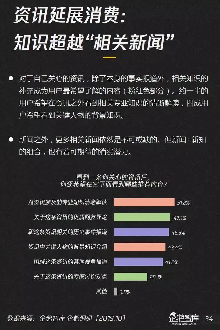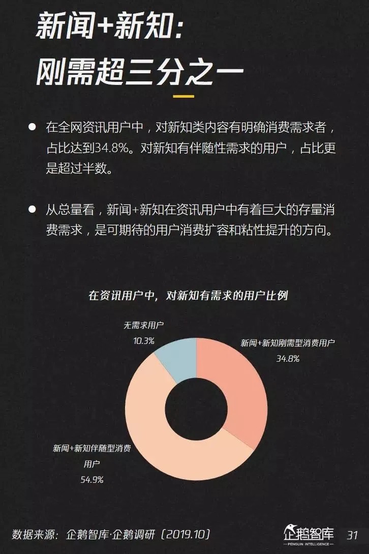 同时,在新闻和新知里,刚需已经超过了1/3。在全网的资讯用户里,对于新知类内容有明确消费需求的人占比为34.8%。