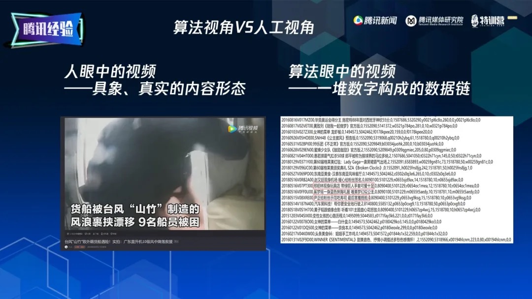 上图直观地体现了算法视角和人工视角。左边是“山竹”台风的视频,右边是机器看到的代码、数字,或者说字段,包括每一个逗号代表的都是不同的内容。