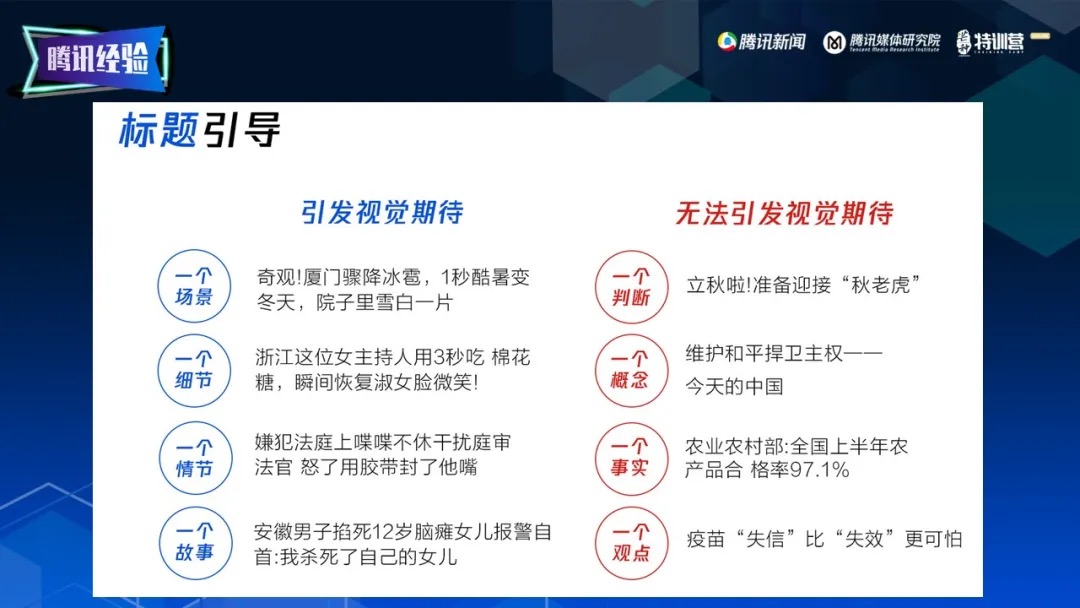 我们再通过下图看看成功的标题引导对比。例如左侧“引发视觉期待”的“奇观!厦门骤降冰雹,1秒酷暑变冬天,院子里雪白一片”;右侧则是一些不太好的标题,例如“立秋啦!准备迎接‘秋老虎’”。包括下面这些让大家有画面感的内容,“嫌犯法庭上喋喋不休干扰庭审,法官怒了,用胶带封了他嘴”,你即使没到现场也能知道现场发生了什么事,如果受众感兴趣就会点进去。