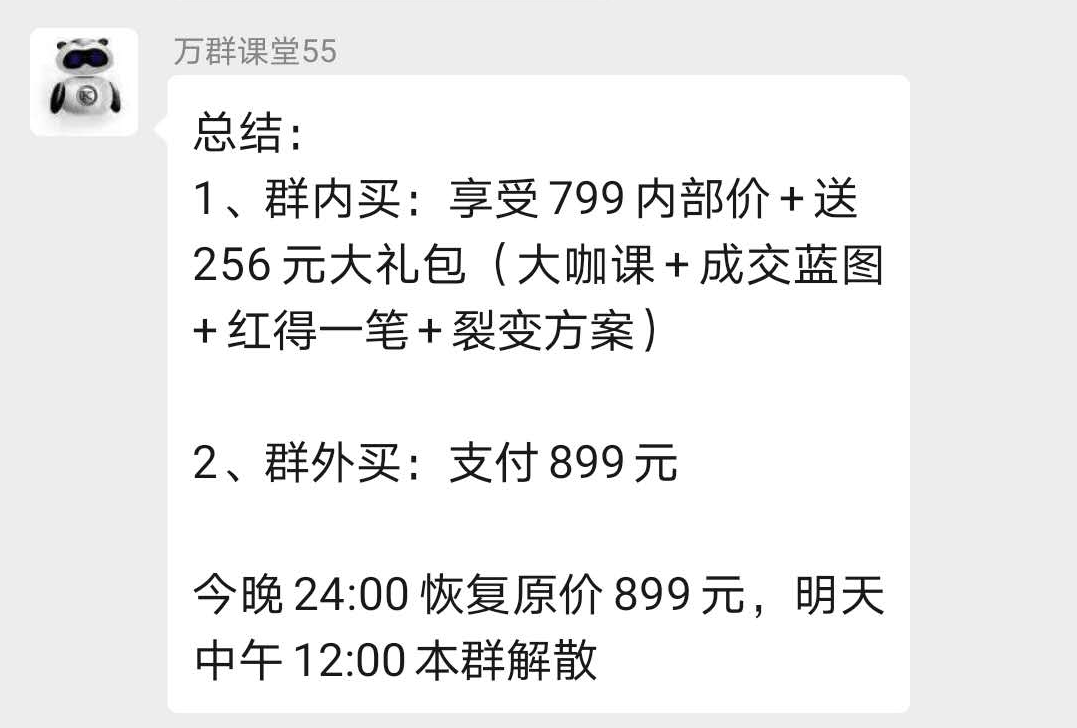 这种用户因为本身已经为参加这次课程付出了一些金钱上的代价,所以可以很大程度上的提高课程的完播率和发广告的情况。但是因为我们做群发售的目的并不是为了赚这点门票钱,所以一般群发售的课程门票价格都会很低,一般在9.9元这个价位。