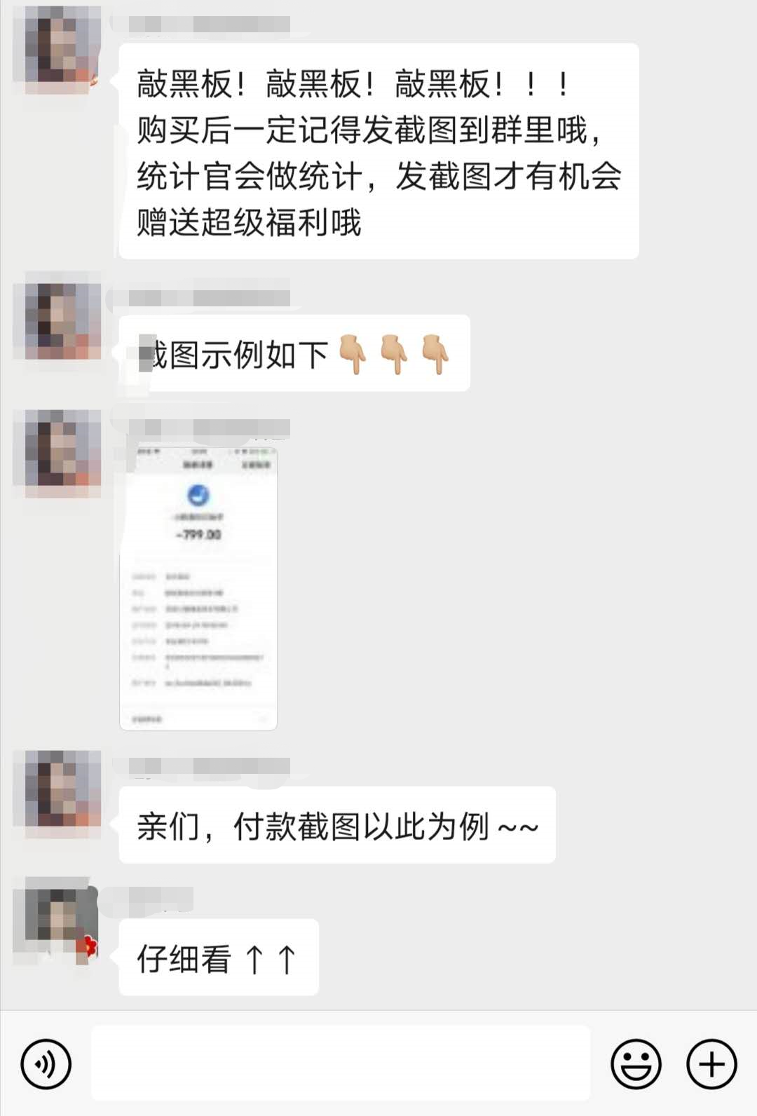 在发送付款链接之前一定要和他们强调要将付款的截图发到群里,以便核对,这样就可以让没有下单还在犹豫的学员觉得原来有这么多人购买了,产生一种从众心理。