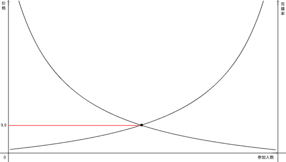 如图所示,当价格不断上涨的时候,参加人数是减少的,完播率是不断增加的。当两条线交汇的时候就是:参加人数X完播率=完播人数 的最大值。