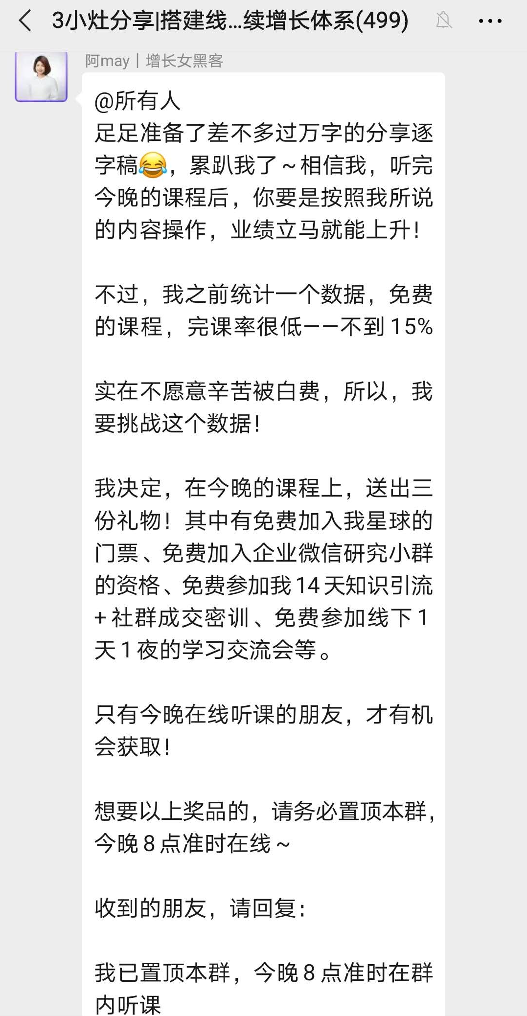 所以一般付费进来的用户,他们对这个课程本身就存在一定的期待,不太需要我们来调动他们的积极性。所以告诉他们上课时间就可以了。甚至很多时候他们自己会活跃起来的。