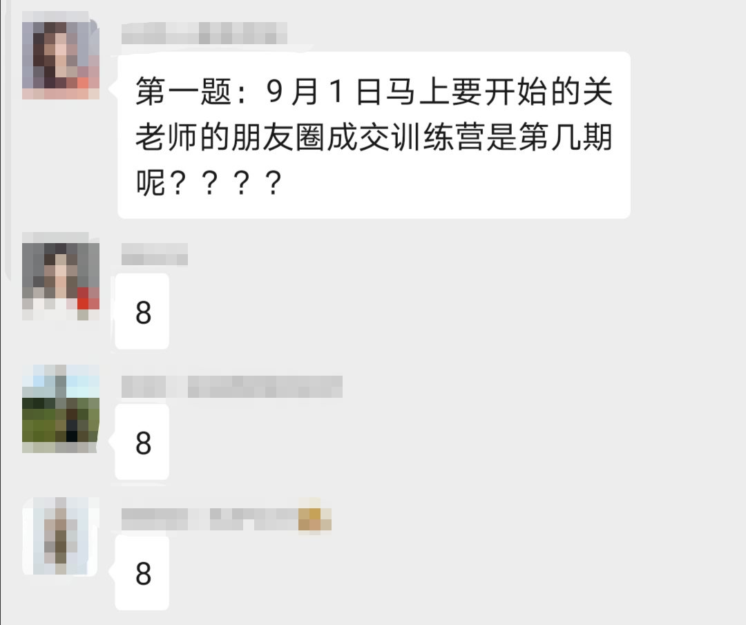 例如:关键明老师的群发售中就会提问这次是关老师的第几期训练营等等。