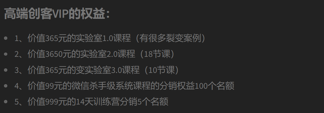 权益即诱饵,两项课程分销的权益,暗示用户获得VIP权益后,可以赚取2万元,远远大于自己所支付的3650元。可以说这是王六六裂变增长实验室最大的诱饵。