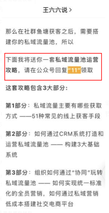 每篇文章、每次活动、每次课程,都设置一个超级诱饵,引导用户进入下一个环节。课程的诱饵前面已经详细解释了,下面再举一个文章中放置诱饵吸粉的案例。