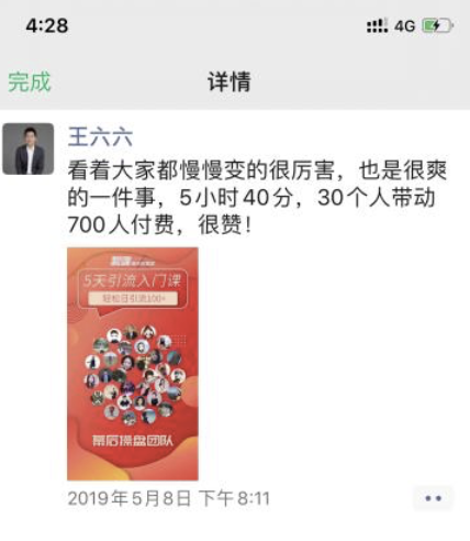 老学员经过培训后会掌握销售文案、互动文案和被动引流的技巧,所以他们可以有效裂变更多用户。引导老学员把自己的收款截图全部发到微信群里面,引起竞争,促进大家都去努力分销