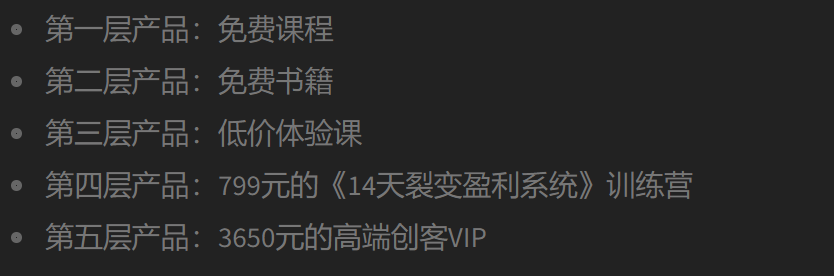 裂变增长实验室的三级产品:引流产品:免费体验课中端产品:7元的《5%操盘手体验课》高端产品:799元的《裂变盈利系统2.0》