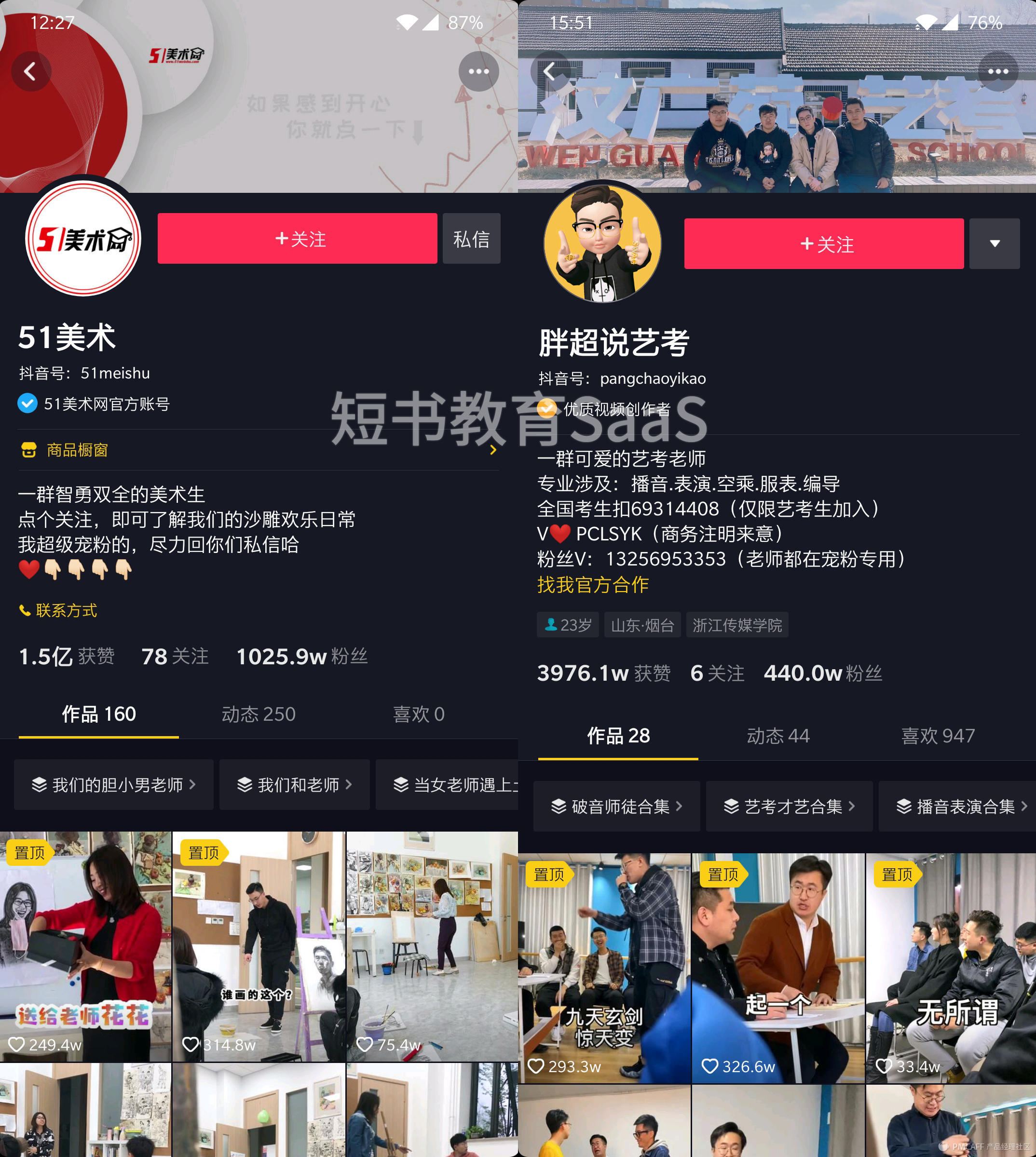 胖超说艺考和51美术的抖音号内容,同婚纱店向单身的人群提供约会服务一样;都是构建客户心中的品牌认知。