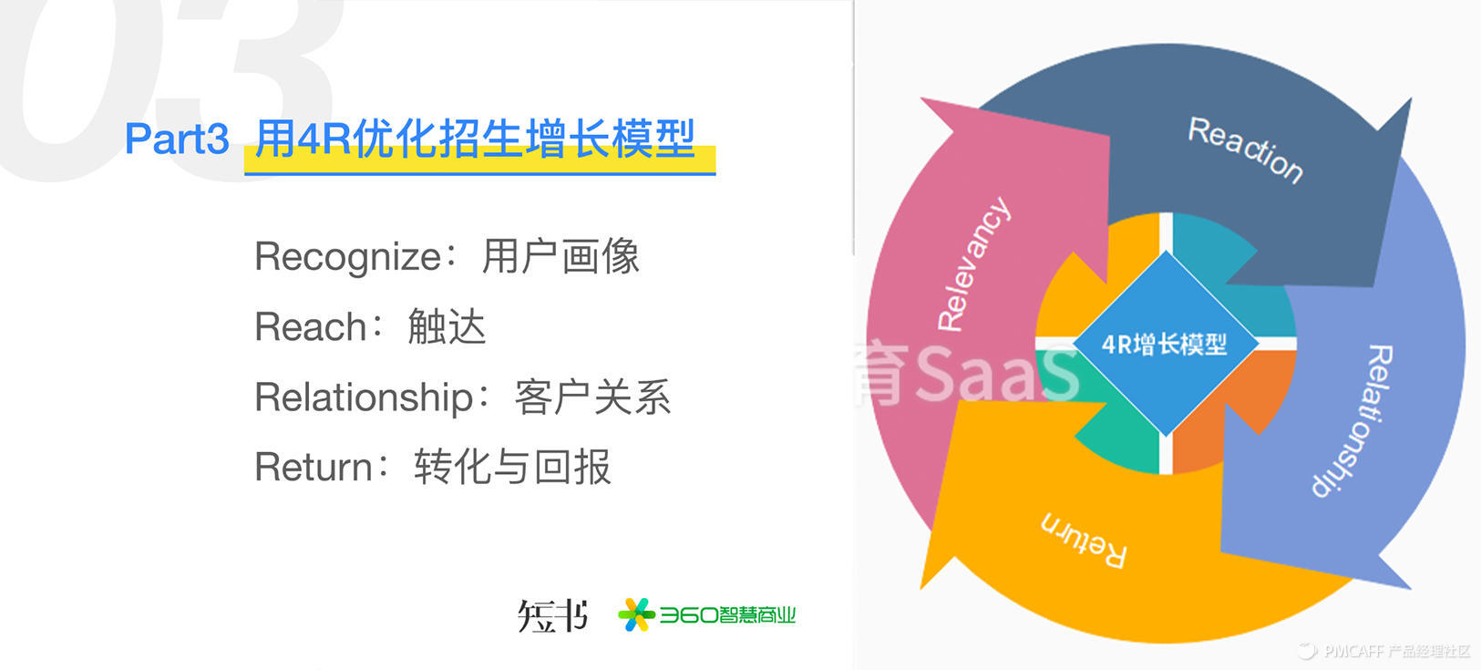 关联(Relevancy)、反应(Reaction)、关系(Relationship)、利润(Return),4R增长模型理论是着眼于教培机构与客户的互动与双赢,不仅积极地适应客户的需求,而且主动地创造需求,运用可优化和系统的思想去整合营销 ,通过关联、反应等形式与客户形成独特的关系。