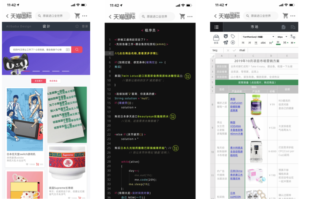 如果实在没有什么尖货,也想不出什么承接创意的特供货品,或者品牌根本没有预算或者来不及生产,这时候还有一招,就是在电商购物体验上承接传播端的创意。比如天猫国际做过一个“上班摸鱼”的创意campaign,真的是把电商页面做成是各种上班族工作的界面,比如outlook收邮箱、Excel拉数据、素材网找图、码农在线编程等。还有通过购物体验与传播端保持一致的创意,比如:华帝的“法国队夺冠,华帝退全款”、gxg.jeans的“下雨就免单”,以及让明星当一日客服抽幸运消费者回复等等。
