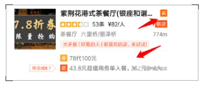 发现好菜是一个新栏目,主要展示附近商家的爆款菜品。所以这里面的关键点是我们需要做出销售额(注意是销售额,不是销量)非常高的单品,然后价格上有吸引力,图片有吸引力,就可以从这个栏目里有效的吸引到流量。