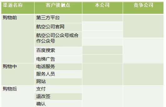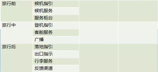 我们以航空公司为例,将客户接触的六大环节,即购买前、购买中、购买后、旅行前、旅行中、旅行后进行客户体验和客户接触点分析。