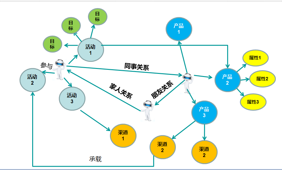 当把企业系统中所有的活动信息、用户信息、产品信息和渠道信息等都关联在一起时,利用知识图谱技术就能形成公司级的活动知识图谱。通过这张知识图谱有可能发现隐藏在用户、活动、渠道和产品之间的一些微妙关系。