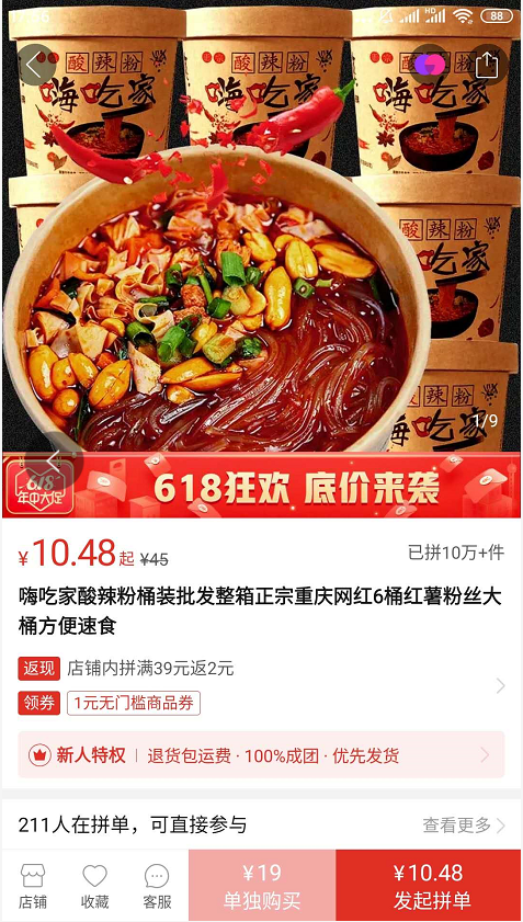 拼多多给用户提供了两种购买方式(如下图),一个是拼团购买,一个是单独购买。