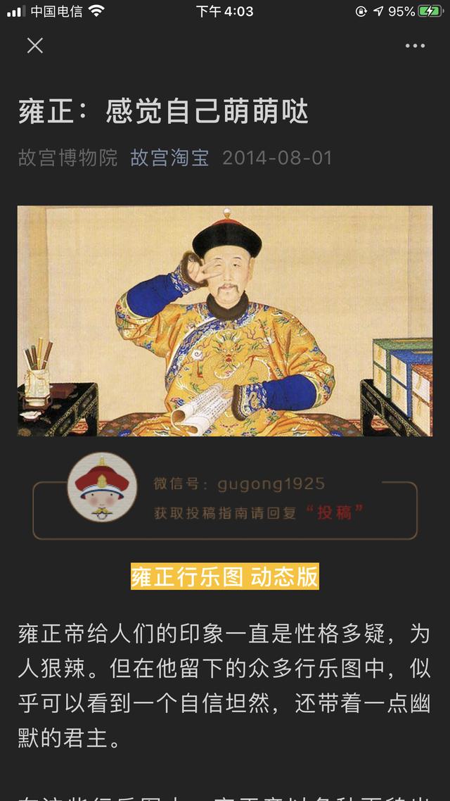 2014年,故宫淘宝发布了公众号文章《雍正:感觉自己萌萌哒》,文章中雍正一改严肃庄严的古代皇帝形象,通过反差感卖萌,获得大众喜欢。