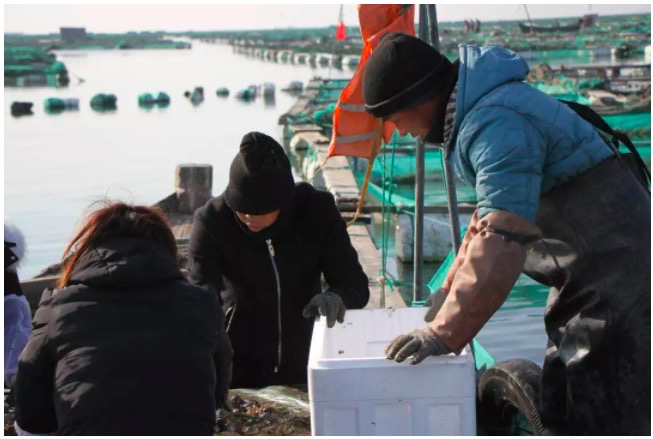 ▲传统线下海鲜供应链,要经过采购商、批发商、农贸市场等六个环节,王广涛家做了十几年海鲜批发生意,可以直接从渔民手里采购海鲜,放到电商平台零售。(受访者供图)