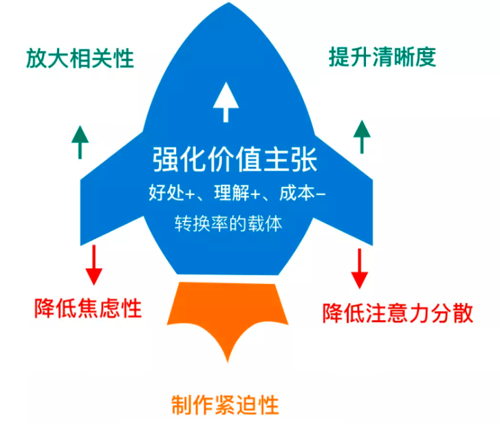 - 清晰度:通过提高信息层级、设计、文案、用户召唤行为四个方面的清晰化,来保障页面清晰度。高清晰的沟通是可以清楚并快速传达你价值主张和用户召唤行为,让用户通过更低认知学习成本的使用产品。
