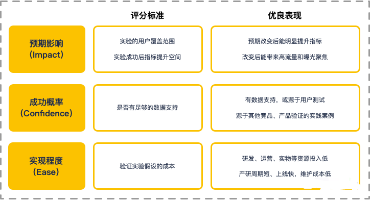 ICE模型通过将大量的实验想法放在影响范围(Impact),成功概率(Confidence),实现程度(Ease)三个维度下进行粗略的评分,得到增长实验假设的优先级进行排序。
