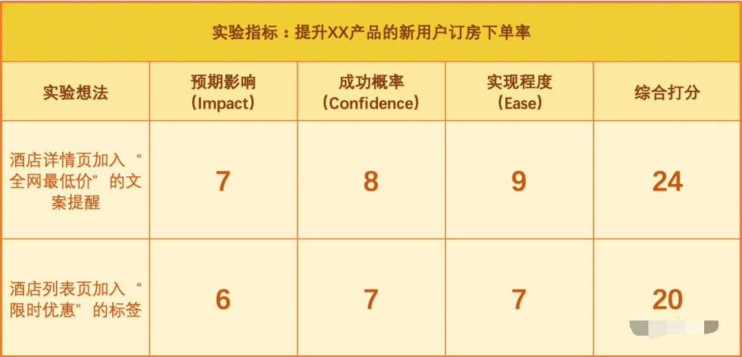 从上述打分,可以得到「酒店详情页加入“全网最低价”的文案提醒」这个实验想法的优先级最高。可以优先进行增长实验。