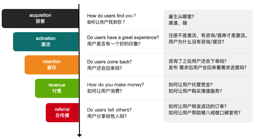 那么从AARRR模型的角度出发,猪八戒网在用户获取后的激活(Activation)、留存(Retention)、付费(Revenue)、自传播(Referral)环节做的如何呢?让我们一起从产品视角出发一探究竟吧。