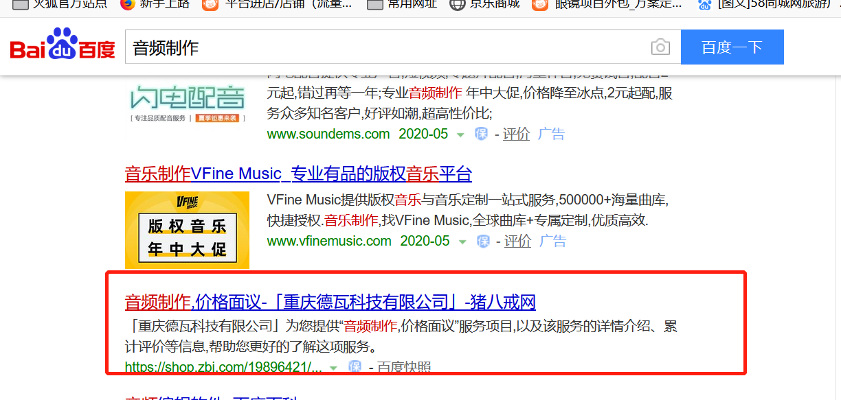 举个栗子:用户搜索“音频制作”这个关键词,可以看到某个在猪八戒网开店的服务商店铺提供的音频制作服务;搜索“网络外包项目”这个关键词,可以看到猪八戒网是专业服务众包平台的介绍。到这一步,如果用户点击了搜索结果进入猪八戒网站则“获客”这一步就完成了。