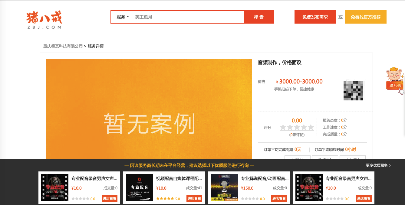 这里给出的补救措施是,在屏幕三分之一处给出了替换方案,推荐了一批优质服务商,看似合情合理地给了用户另一条出路,但定睛一看这四个推荐的“优质服务”依然是0评分、0成交 的服务…… 这推荐您可走点心吧!