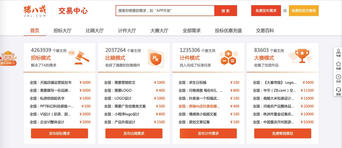 猪八戒网是一个企业服务交易市场,打个比方淘宝网提供的是B2C、C2C的实体产品售卖,猪八戒网提供的就是B2B、C2B的服务产品售卖——主要集中在设计、IT开发、营销方案这几个领域。