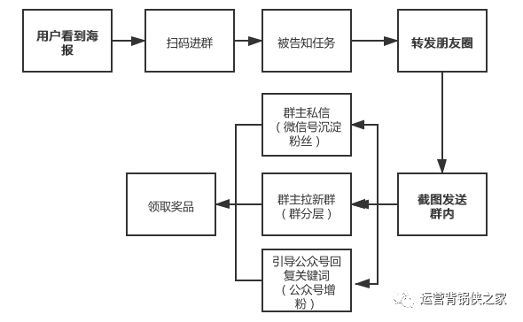 举个例子:某裂变活动流程为用户看到海报-扫码关注公众号-公众号自动回复活动说明-转发朋友圈-截图发送公众号-领取奖品——最后目的是最大限度为公众号增粉。