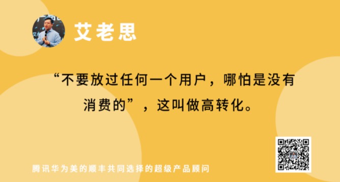 特别记住“不要放过任何一个用户,哪怕是没有消费的”,这叫做高转化。