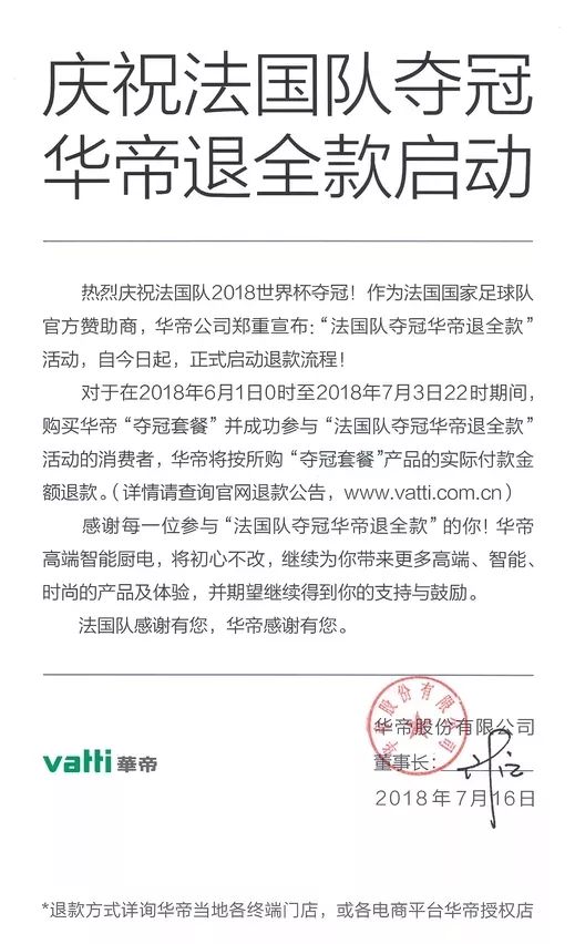 当世界杯决赛结束,法国队真的夺冠时,正如华帝之前的承诺,他们第一时间就宣布:华帝退全款活动正式启动!