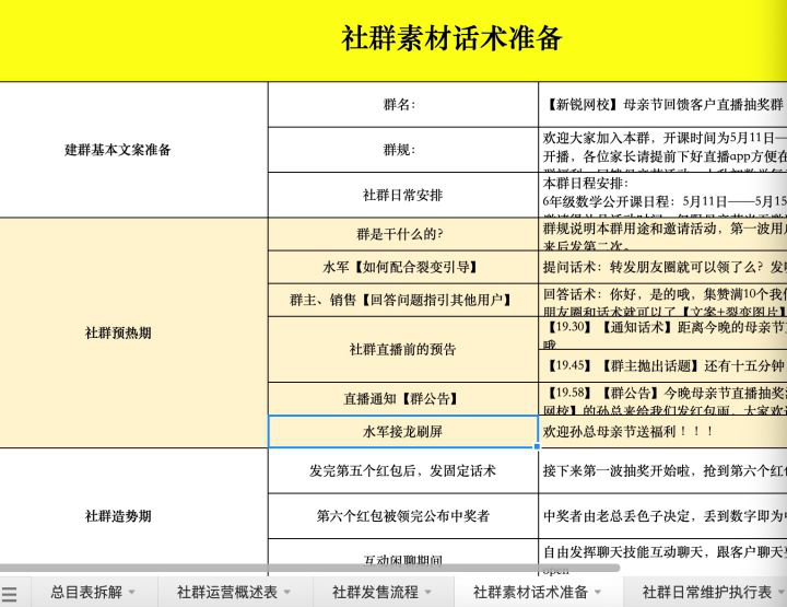 我们需要知道的一件事是Excel的文档比Word文档更加具有执行力。所以,我们通过Excel去做社群的SOP,掌握好时间节点、发售流程、话术编辑三大核心板块就可以把该做的事情安排的稳稳当当。